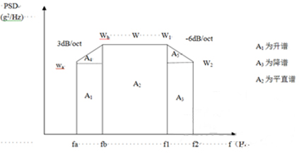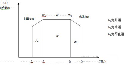 為了簡(jiǎn)便起見,往往將功率譜密度曲線圖劃分成若干矩形和三角形,并利用上升斜率(如3dB/oct)和下降斜率(如-6dB/oct)分別算出wa 和w2,然后求各個(gè)幾何形狀的面積與面積和,再開方求出加速度總均方根值。